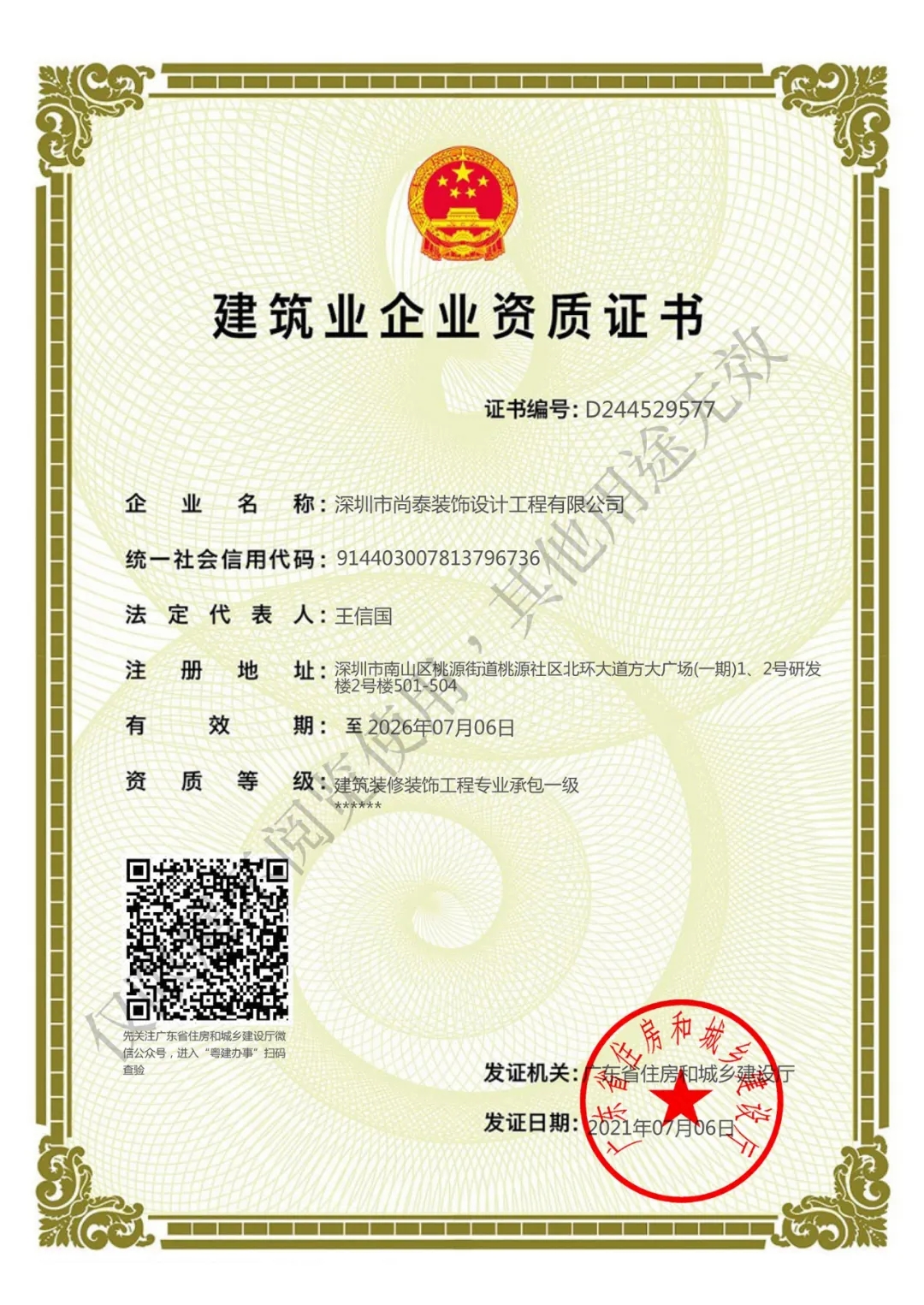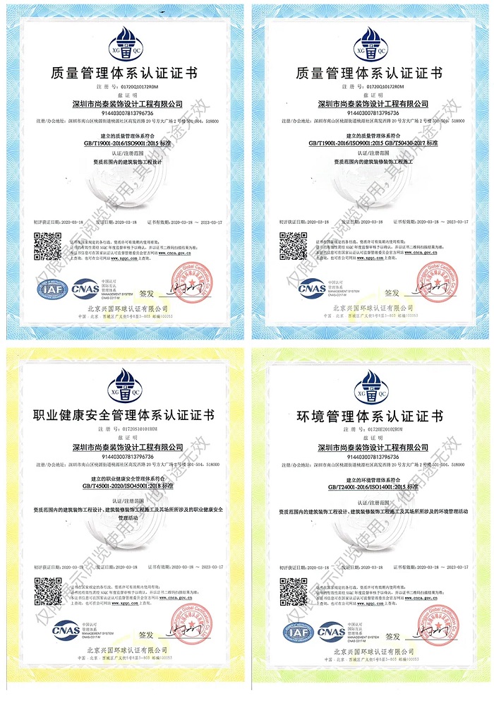 經廣東省住房和城鄉(xiāng)建設廳審核批準, 深圳市尚泰裝飾設計工程有限公司于2021年7月6日獲得建筑裝修裝飾工程專業(yè)承包一級資質。該資質的取得,標志著尚泰裝飾在人才規(guī)模、工程施工、項目業(yè)績、技術標準、管理水平等關鍵指標上達到了較高標準,將進一步提升公司的市場競爭力,為公司拓寬業(yè)務范圍、擴大經營規(guī)模創(chuàng)造了有利條件,也標志著公司綜合實力獲得肯定,為建筑裝修裝飾行業(yè)的發(fā)展和轉型升級貢獻力量!