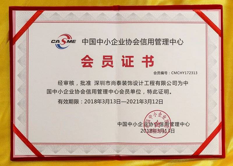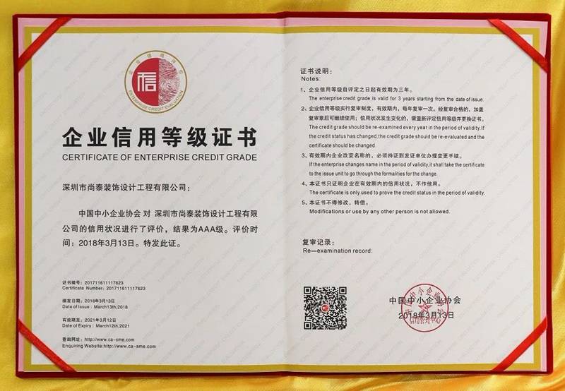 2018年3月13日,中國中小企業(yè)協(xié)會為深圳市尚泰裝飾設(shè)計工程有限公司頒發(fā)了企業(yè)信用等級證書,對深圳市尚泰裝飾設(shè)計工程有限公司的信用狀況進行了評價,結(jié)果為AAA級,證書編號:201711611117623。同時,中國中小企業(yè)協(xié)會信用管理中心批準(zhǔn)深圳市尚泰裝飾設(shè)計工程有限公司為中國中小企業(yè)協(xié)會信用管理中心會員單位。