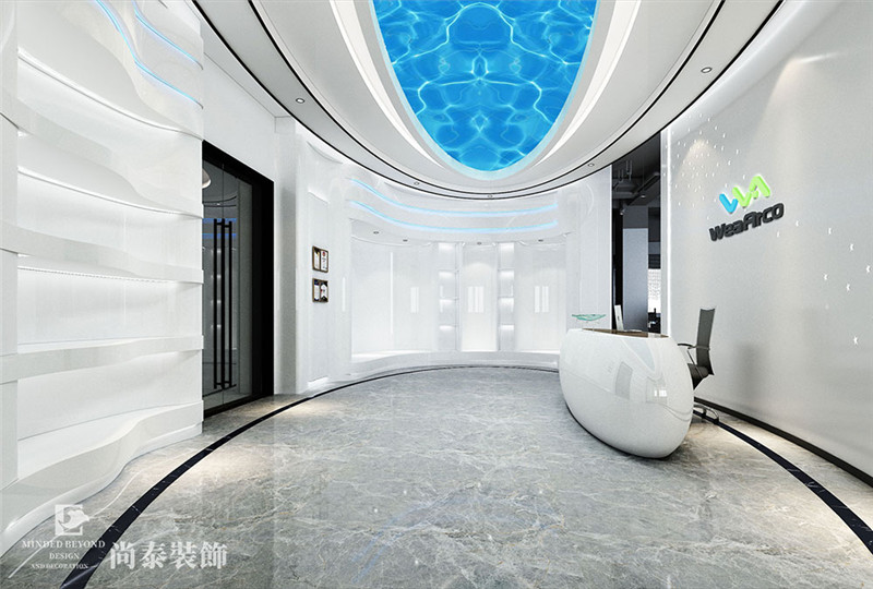 4、寫字樓大廳最好能體現(xiàn)出空間的高端感,地面一般采用大尺寸的大理石進行裝飾,大理石表面的光澤會給人帶來非常高端的視覺效果。天花板的造型最好使用幾何圖案,設(shè)計簡潔高雅,能突出空間層次感。