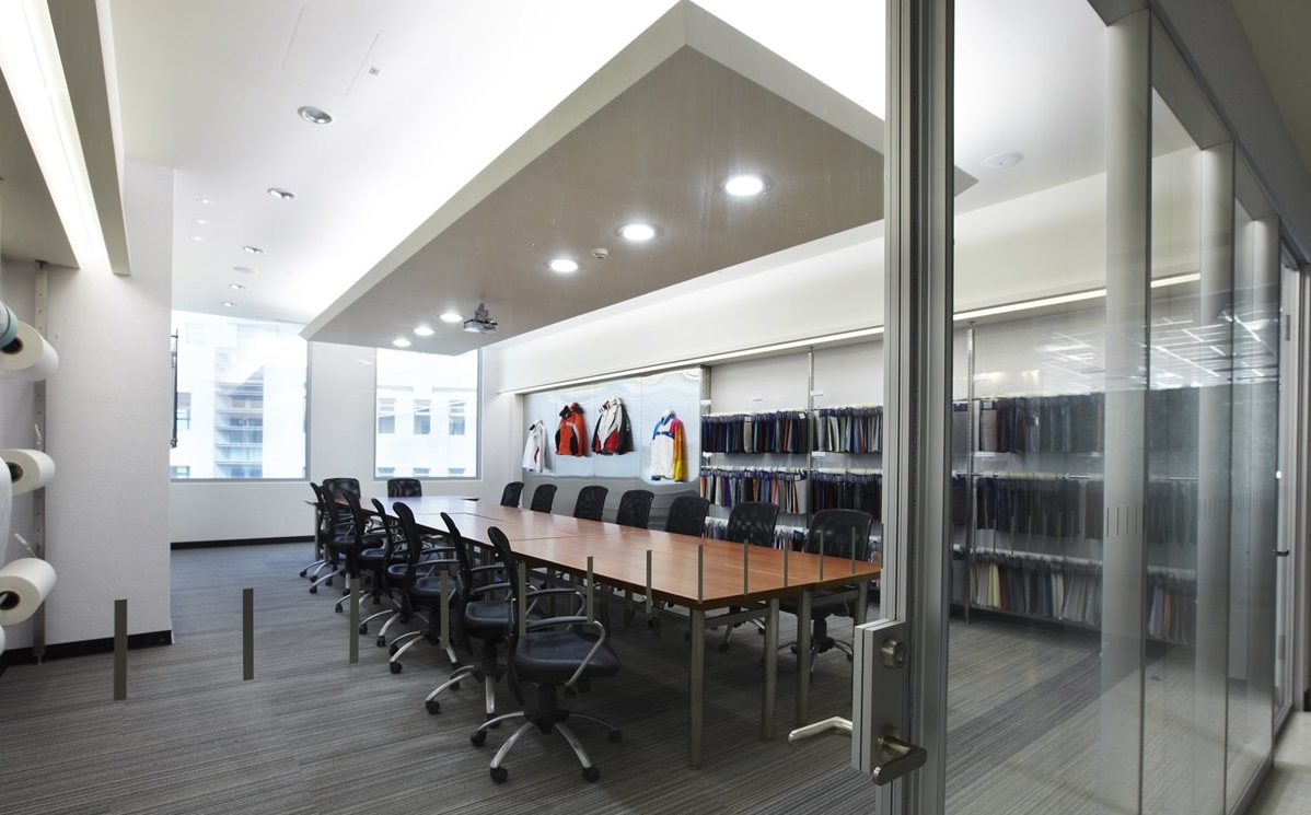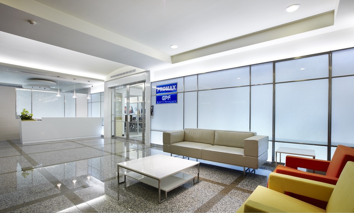在迎賓大廳內(nèi),采霧面材質(zhì)做為四周墻面,并以亮面大理石鋪陳地坪,展現(xiàn)大器簡約感,將大量純白色作為空間主調(diào),給人清爽舒適的體驗,同時巧妙配置兩張色彩鮮明的沙發(fā),讓跳躍色彩增添視覺活潑度,藍(lán)色招牌則使用壓克力雕刻,并配置超薄 LED 燈,營造出反射的立體效果,加深品牌印象;會議室采用清玻璃門片,維持整體空間的通透感,使開會氣氛透明且公開,并在會議室兩側(cè)墻面注入展示機能,用來放置公司商品,在整齊的陳列之下,給人一目了然的感受!