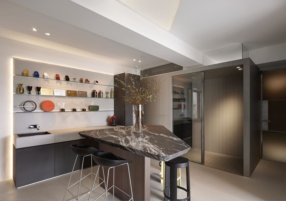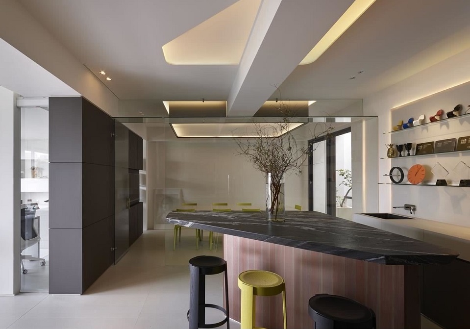 兼具接待、休息與會(huì)議的區(qū)域,擺放花崗石面、不規(guī)則切割的桌,讓空間、動(dòng)線更活潑。