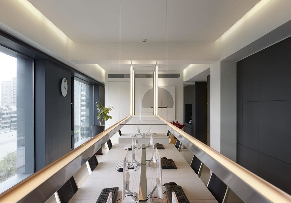 辦公區(qū)將鐵件LED燈置中,以墻面、窗景呼應(yīng),展現(xiàn)設(shè)計(jì)人對(duì)比例的極致追求與對(duì)稱之美。