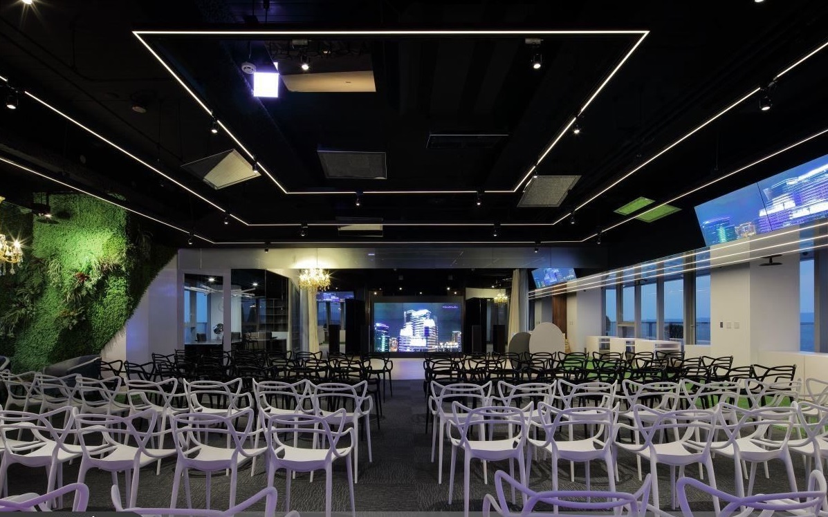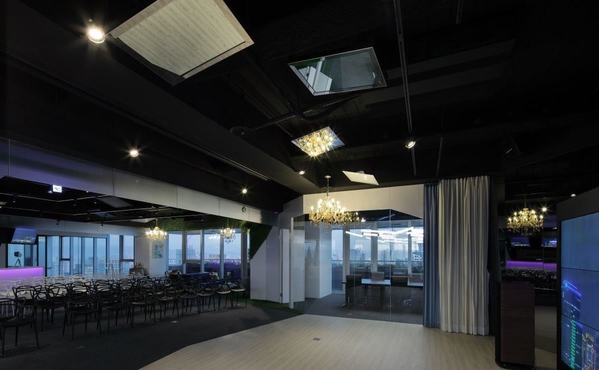 整個空間跳脫了格局的限制,設(shè)計師以大量不規(guī)則的線條語匯,包括多層次的線性光帶、噴黑的天頂結(jié)構(gòu)、管線等創(chuàng)造活潑視感,也達到視覺極致延伸的效果,連展演區(qū)座椅的采購,也選擇黑白雙色、并擁有鮮明線條造型、易于收納的款式,與現(xiàn)場的黑白灰階基調(diào)相呼應(yīng)。但除了沈穩(wěn)兼具個性的中性灰階之外,也不忘融入塊體、幾何元素的穿針引線,醞釀全區(qū)源源不絕的動態(tài)活力,像是一旁休憩區(qū)鋪設(shè)的人工草皮、用于重點端景立面的植生墻綠意、以及和整體現(xiàn)代簡約風(fēng)格強烈對比的古典水晶燈等等,都為空間感官帶來豐富的藝術(shù)養(yǎng)分!