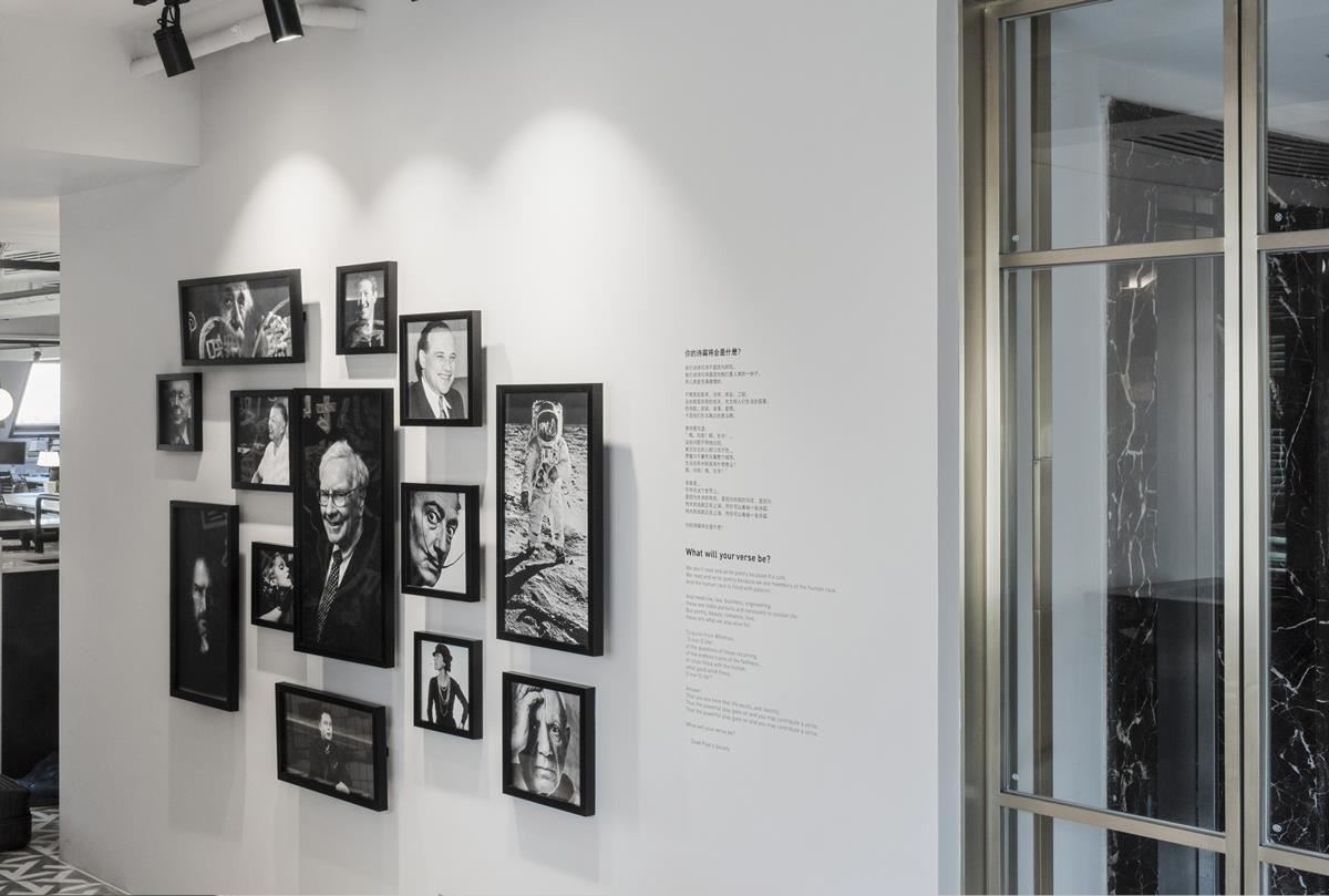 ▲通往辦公區(qū)域的廊道名人墻,向各個領域的佼佼者致敬,并預示著在內的新創(chuàng)者將譜出自己的詩篇。