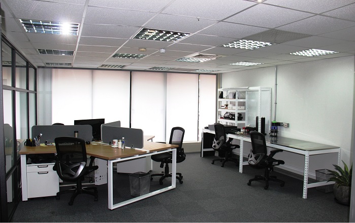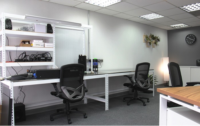 傳統(tǒng)的OA辦公家具的外觀都比較呆板,格屏的高度也較高容易遮蔽視線。業(yè)主希望讓辦公環(huán)境看起來活潑,所以選用新式的三人工作站,工作桌面成圓形排列但使用面積不變,有效利用室內(nèi)空間。另外降低隔屏高度,同事間溝通更容易。主要辦公區(qū)域采用開放式的配置,在辦公區(qū)旁的是簡易維修區(qū),負(fù)責(zé)不同工作的兩組人可立即地互動(dòng)討論。