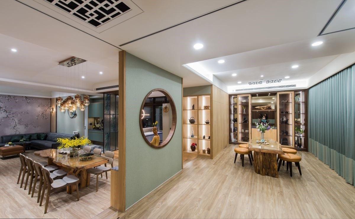 60坪的空間里,為了打造屋主期待結(jié)合辦公室與招待所的需求,尚泰裝飾的設(shè)計師屋主喜愛的新古典元素為基底,并融入男屋主收藏的檜木藝術(shù),透過異材質(zhì)創(chuàng)意巧思,混搭出充滿東風(fēng)禪意與華麗古典的新穎美學(xué)。