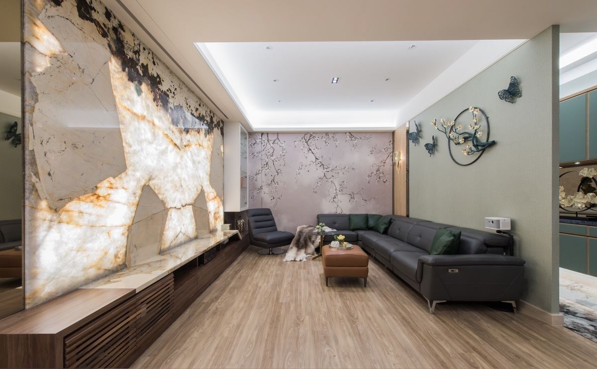 玄關(guān)鋪陳雪山藍大理石地坪,與一旁運用青花瓷打造的大理石臺面與藝術(shù)品陳列,交織出雅致非凡的迎賓風(fēng)尚;以窯燒玻璃與鐵件搭建一道頂天的屏風(fēng),穿透的肌理讓光線可自在流淌一室,且結(jié)合180度旋轉(zhuǎn)的活動設(shè)計,可依需求調(diào)整立面位子,達到避開風(fēng)水禁忌的疑慮。電視墻以絕美石材打造,鮮明的獨特肌理與色澤,搭配兩面背墻分別以枝葉花卉壁紙,與蝴蝶裝置藝術(shù)的自然語匯,特調(diào)出無限自然生命力。