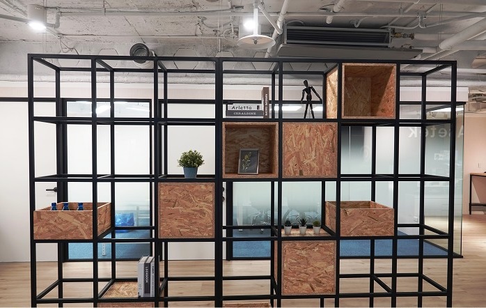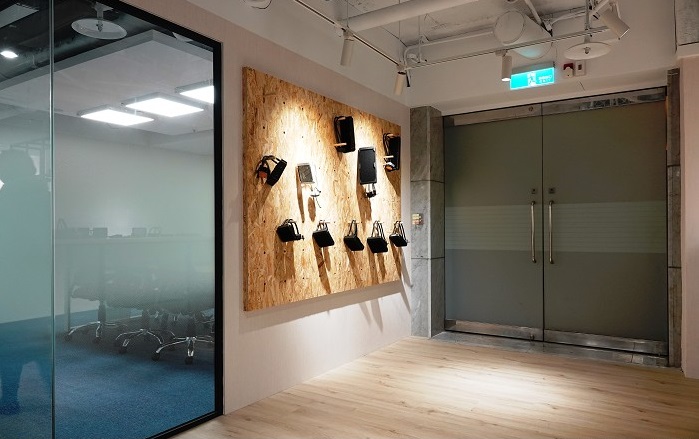 一進(jìn)入辦公室公司名稱及產(chǎn)品印入眼簾,承襲公司一貫的簡約風(fēng)格,深色墻面搭配純白字體將視覺集中于產(chǎn)品上,讓產(chǎn)品成為空間的裝飾品,不做過多的設(shè)計搶走產(chǎn)品的重要性;展示墻使用OSB洞洞板負(fù)責(zé)吊掛陳列商品,配合不同需求變化各種展示方式。