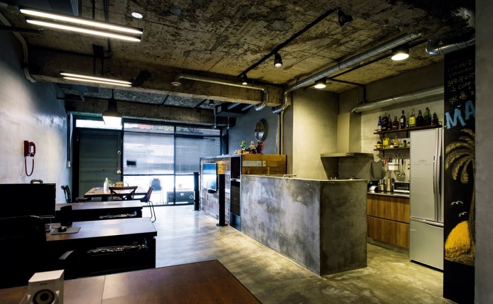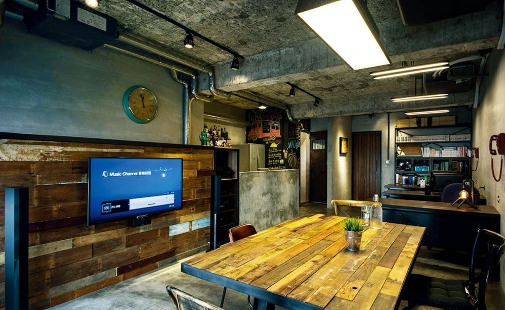 由于是將工作室結(jié)合臨時住宅的機能,方便兩人與同事工作之馀也能在這個空間休憩與沉淀,因此開放的格局及多元動線規(guī)劃是首要考量,將原本陽臺連結(jié)室內(nèi)的隔間拆除,采用大面玻璃窗及采光罩,導(dǎo)入大量光線,加上貨柜門的大門,從這里就感受到粗獷隨興的工業(yè)風(fēng)格;公共區(qū)域除了工作區(qū)外,設(shè)計師將原本在屋后端的廚房移到公共空間,用水泥粉光打造中島吧臺,營造出個性又原始的廚房,結(jié)合原木大餐桌的形式,讓這里成為員工開會及接待顧客的場域,也可以是休閑放松的客餐廳及聚會場所,廚房旁邊的客衛(wèi)隔間墻采用黑板漆打造涂鴉墻,設(shè)計師特別為客衛(wèi)打造一扇宛如監(jiān)獄門的門片,增加不少趣味性,也展現(xiàn)設(shè)計師的創(chuàng)意、風(fēng)格及個性。