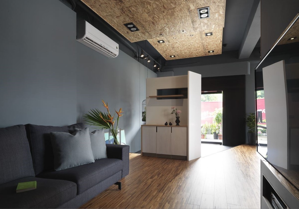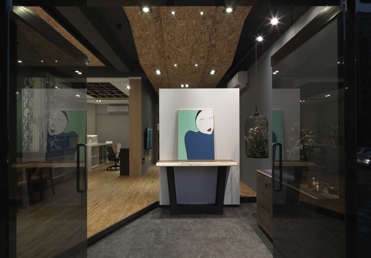 進(jìn)入空間之前,黑色烤漆搭配清玻璃打造而成的大門,已透露了空間的現(xiàn)代美學(xué)質(zhì)感,讓人留下最佳印象。而空間內(nèi)部則根據(jù)使用需求,將格局大致區(qū)分為工作區(qū)、洽談區(qū)、沙發(fā)區(qū)、儲藏室及茶水間等。入口玄關(guān)處一道白色藝術(shù)端景墻讓視覺效果得到緩沖,并且具有指引動線的作用,上方的折線型木質(zhì)感天花板,巧妙展現(xiàn)了幾何造型美學(xué),讓人一進(jìn)門便感受到濃厚的藝術(shù)設(shè)計(jì)氣息。再往內(nèi)走,玄關(guān)端景墻后方是沙發(fā)區(qū),讓來訪的客戶可以在此暫時(shí)休憩,灰色電視墻與書墻形成完整空間感,營造出居家空間般的舒適氛圍。