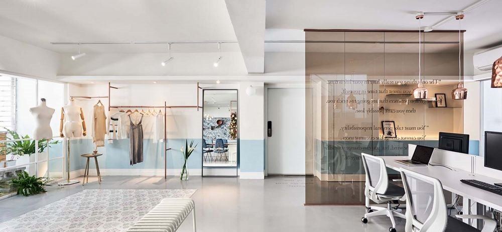 此處規(guī)劃為辦公區(qū)域,一旁則是儲(chǔ)藏收納與裁縫區(qū)塊,其中茶玻隔墻添入品牌核心概念,時(shí)時(shí)提醒著創(chuàng)業(yè)初衷。