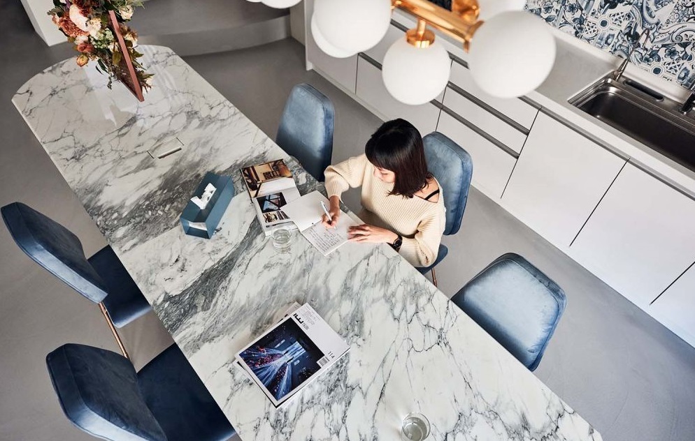設(shè)計(jì)師以維持空間一致性為重點(diǎn),廚房壁面選用藍(lán)色調(diào)來(lái)搭配業(yè)主本身的餐椅,鋪設(shè)精致典雅花磚帶出變化;避免空間方正而銳利化,其中加入圓弧造型設(shè)計(jì)墻面,長(zhǎng)型圓邊大理石餐桌擺設(shè),并以古銅色調(diào)點(diǎn)綴餐桌框線與圓弧造型,營(yíng)造整體延伸性。