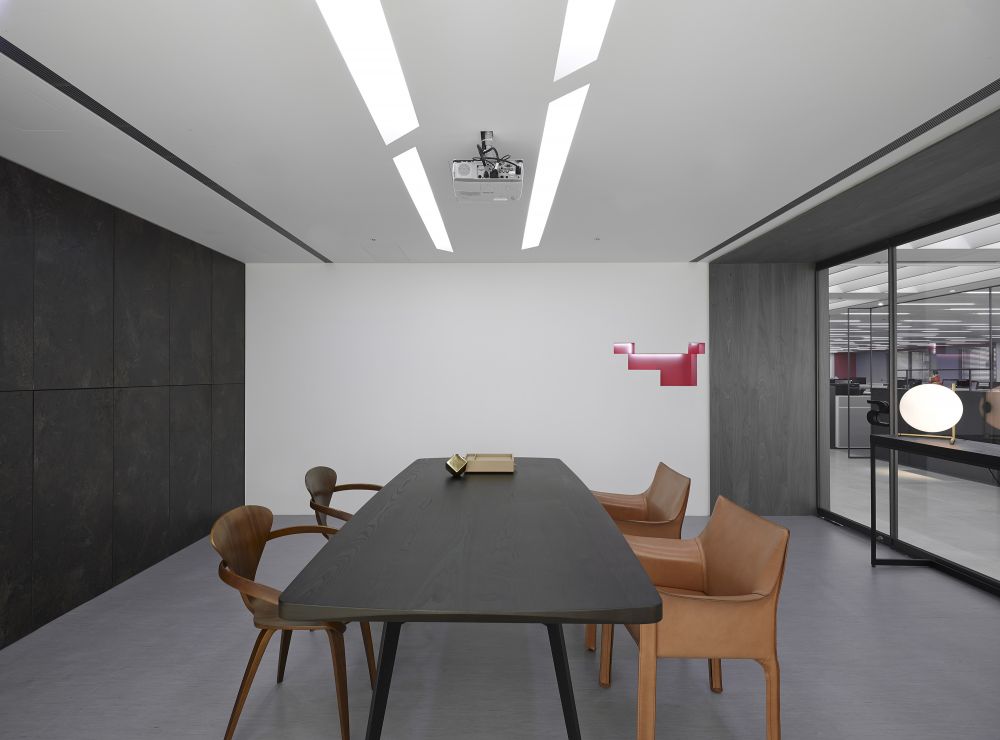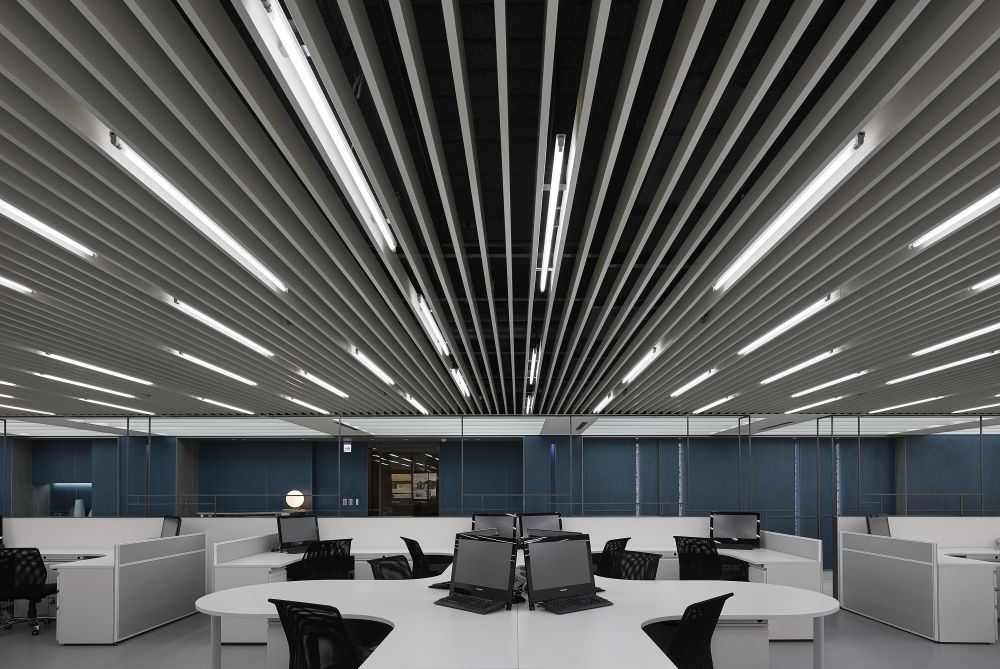 大量使用企業(yè)主色之一的深藍妝點,讓空間跳脫單調(diào)沉默之感,木板中偶爾銜接藍色沖孔版,讓墻面有光影流動更顯層次與趣味。天花以強烈的直束光帶延伸了天花板的視覺,也拉高了空間感。
