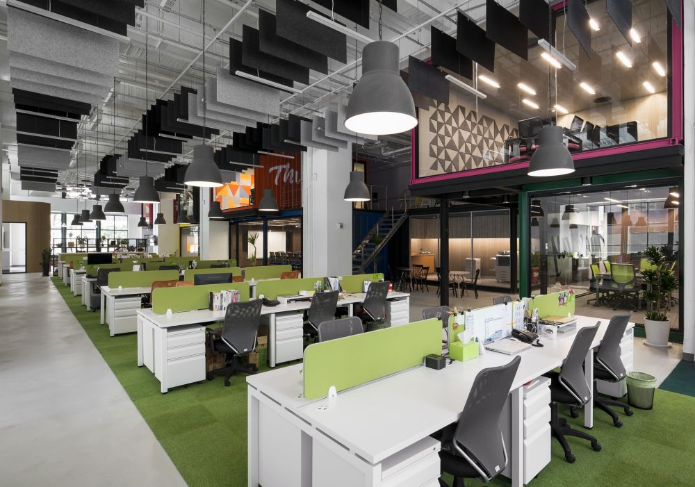 以公司品牌的青草綠為主視覺,配上灰與白,使色調(diào)中和,再配上地板的草皮,讓辦公區(qū)呈現(xiàn)自由舒適的氛圍。