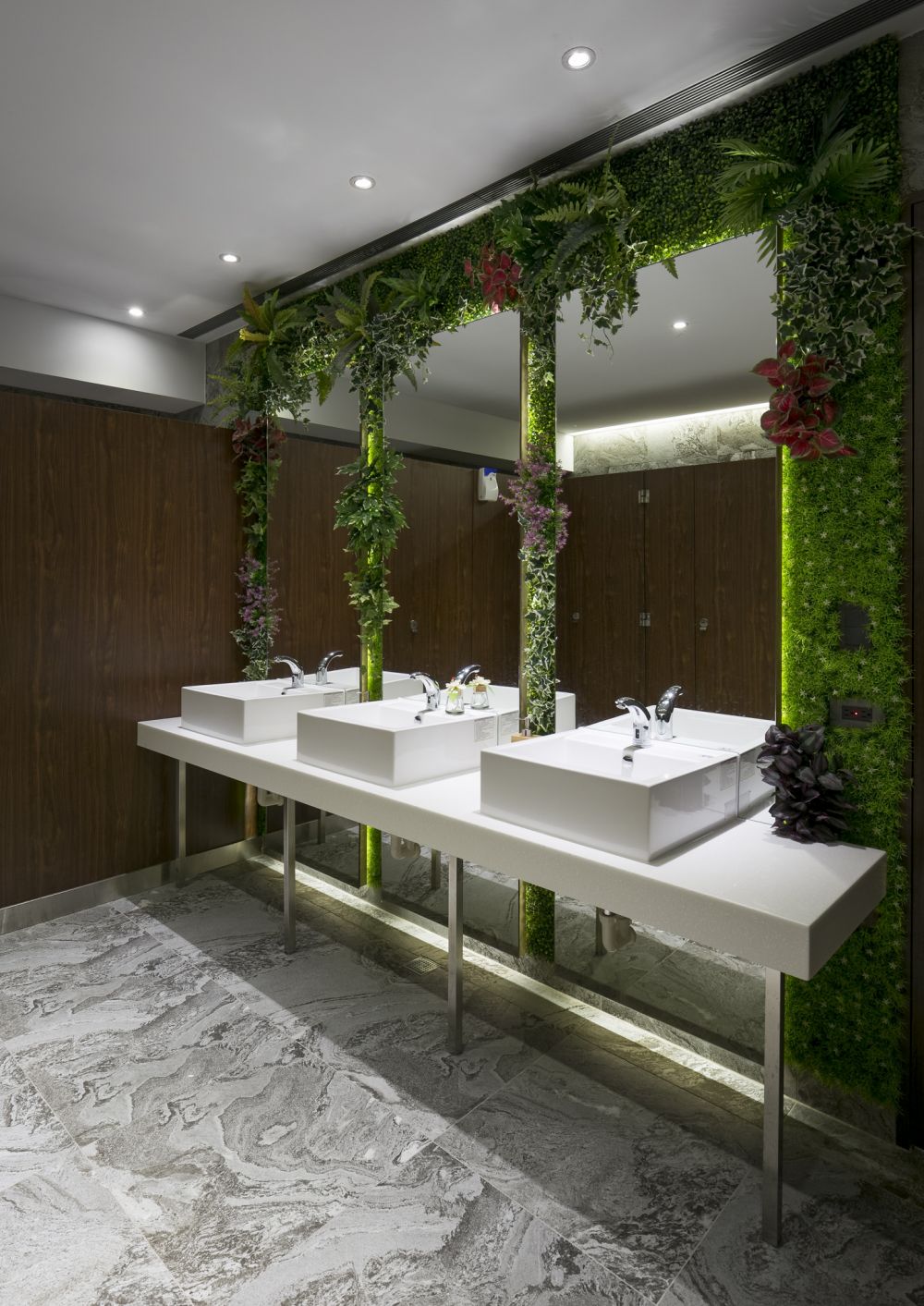 利用較耐陰的植物做成植栽墻,讓使用者有仿佛進(jìn)入森林之感,使廁所都別致精美,植栽墻除了增加景色外還有吸附異味的用處,讓廁所時(shí)時(shí)保持清香。