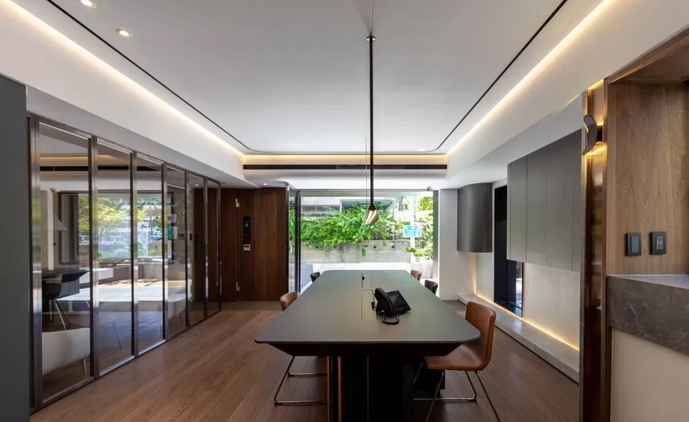 說到隔間,墻體隔間無論是居家或是辦公空間都是常見且必要的,但是為了能讓辦公室發(fā)揮最大坪效及提供員工的工作效率,大面積的開放式設(shè)計是現(xiàn)代辦公室設(shè)計潮流,而如果遇到需要隱私的空間,建議可以如下圖會議室使用大面積的拉門取代隔間,平時敞開賦予開闊的空間感,會議進行時則關(guān)起拉門不受外界干擾。