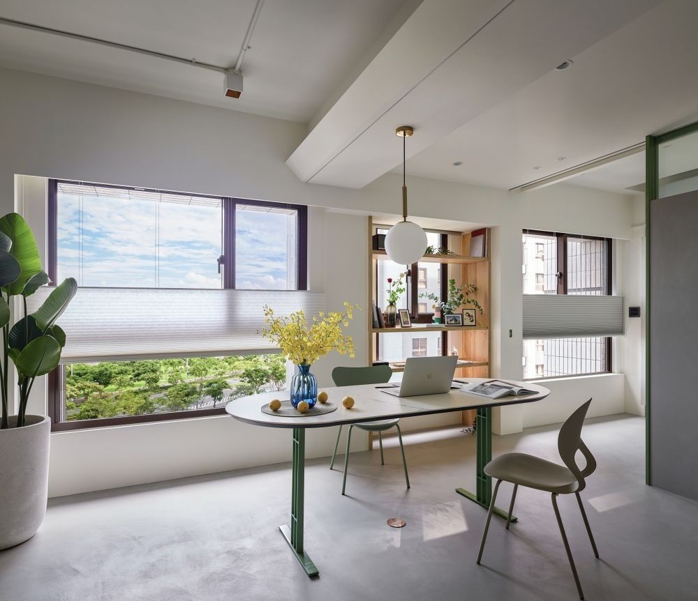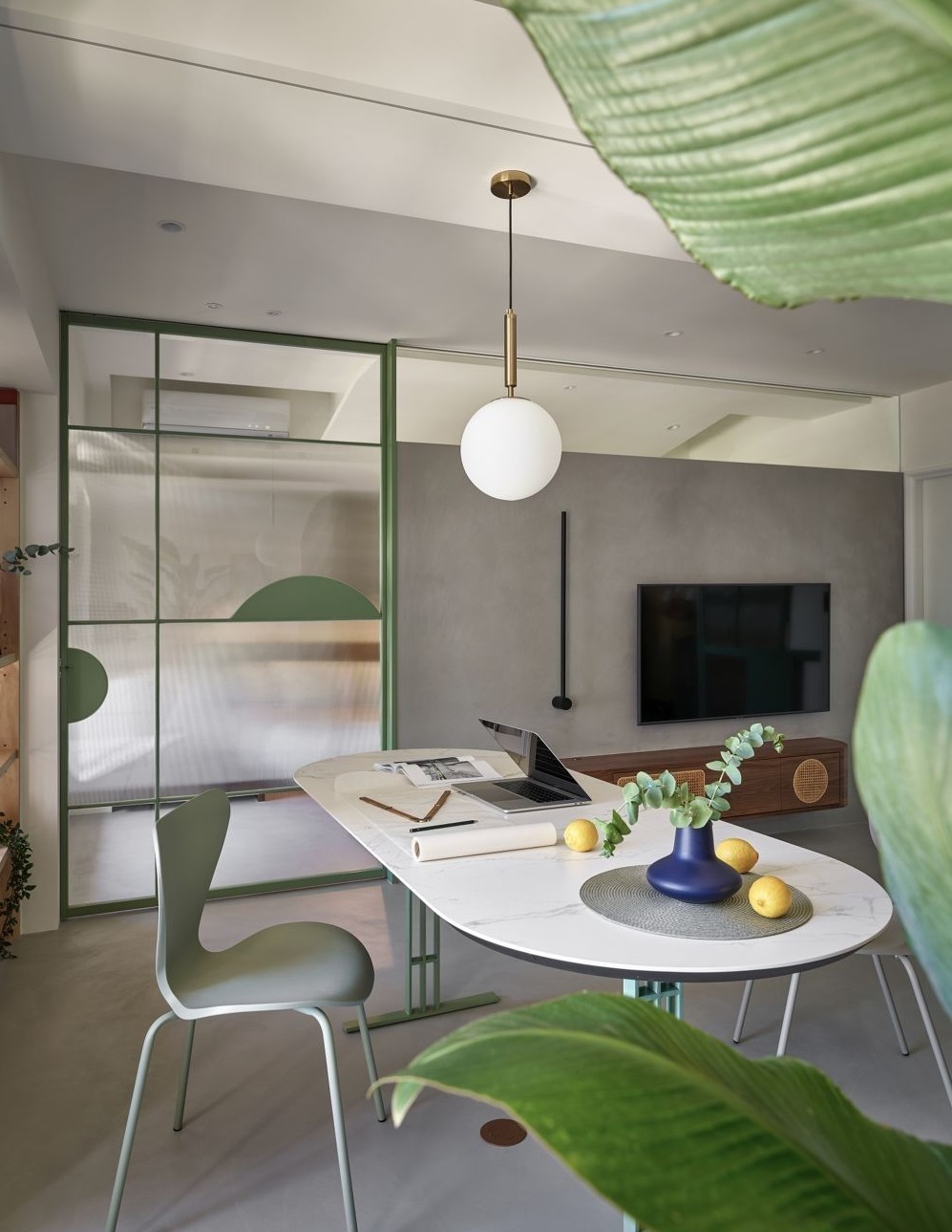 不敢相信,這真的只有30平嗎?看起來超寬敞舒適!清爽綠搭配大面窗景和充足采光,先不說住在這里,光是在這樣的空間中上班就已經(jīng)夠幸福啦~