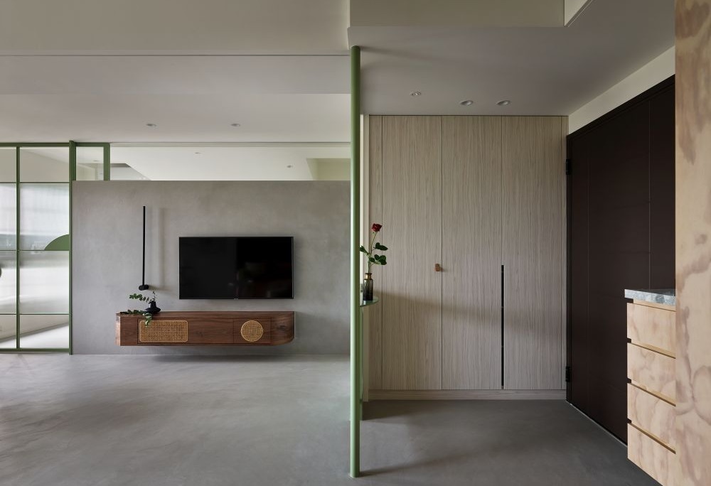 為避免開門見內(nèi),玄關(guān)處規(guī)劃了一座玻璃屏風,并刻意導(dǎo)了圓弧角,柔和視覺外,也讓空間多了獨特性。而除了屏風之外,墨綠色主墻、訂制的工作桌、主臥的鐵件拉門,也都是延續(xù)圓弧曲面的有趣元素。
