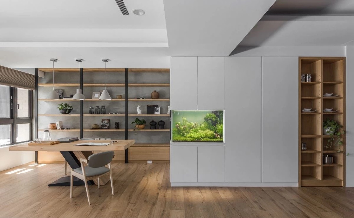 梁下打造灰階收納柜且延伸至餐廳區(qū),中央嵌入水族缸設計,注入一股清爽氣息,替空間創(chuàng)造切換場域的美學端景。木格柵屏風界定餐廚區(qū)域,保有光影與視線的流動與延續(xù),中島銜接大型原木餐桌,木質(zhì)桌體搭配白色中島臺面與家電,交織日系寧靜的美好氛圍。