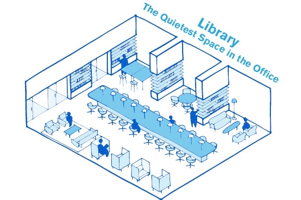 第一類是“圖書館”,采用了開放和私密混合的形式,既有未分配的協(xié)作臺,也有獨立安靜的隔間,讓人專注解決工作,適合存在多種工種類型的企業(yè),密切的協(xié)作和不被打擾的專注可以同時存在。