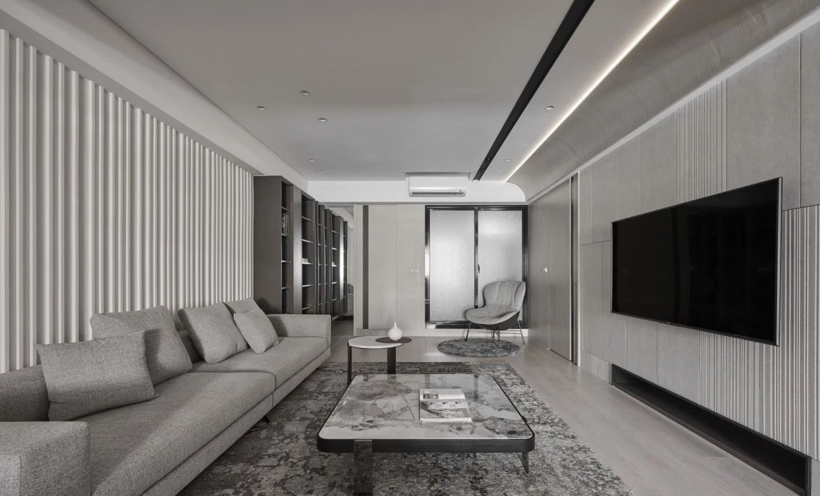考量到屋主育有新生兒,因此公共空間維持開(kāi)放式設(shè)計(jì),把廚房、餐廳、客廳規(guī)劃于同一軸線上,即便是在廚房做菜,也可以隨時(shí)照看小朋友,感到安心。天花板在電視墻的一側(cè),借由圓弧造型修飾,弱化梁柱帶來(lái)的方正感,而通往私領(lǐng)域的門片,也都融入墻面線條里,讓視覺(jué)顯得簡(jiǎn)潔俐落。