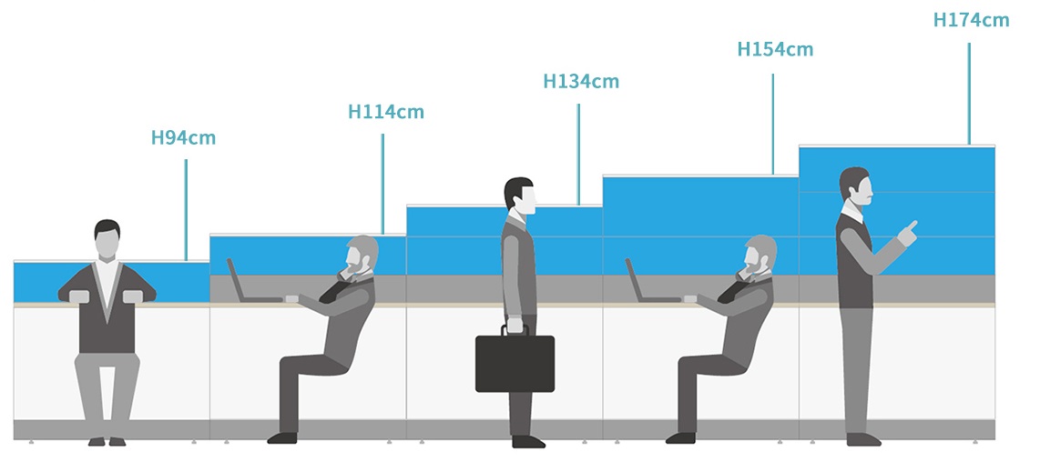 超過坐姿視覺高度,可有效阻隔視野,提供良好的私密性和隔音效果,需站立始能呈現(xiàn)交流與溝通,適用稍具私密性之財務(wù)、法務(wù)、企劃、或簡易區(qū)隔部門別或做為部門管理職的辦公桌規(guī)劃,