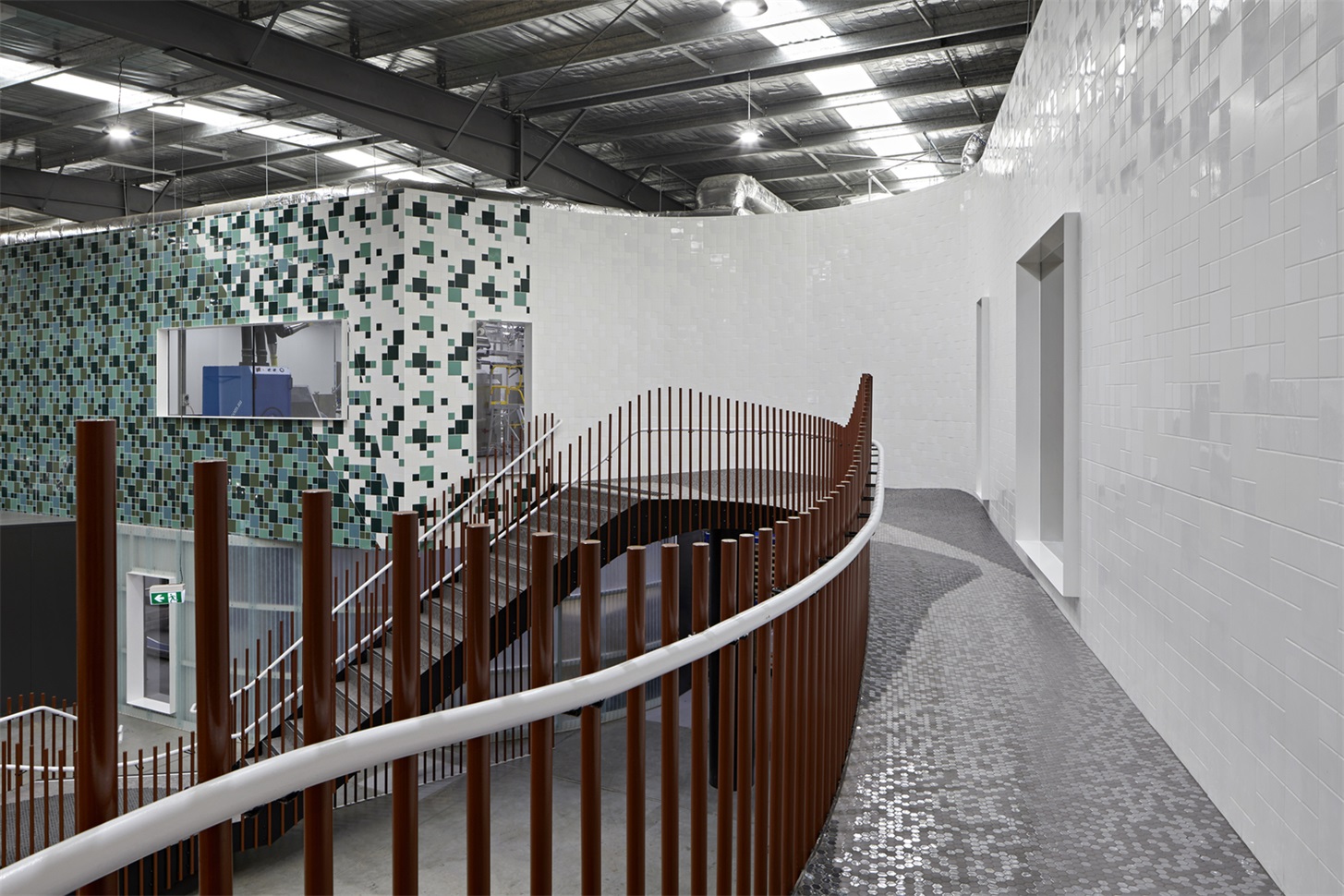 利用Hundertwasser的植被螺旋,景觀的精神–通過顏色和紋理來表達(dá)–被鼓勵從附近的本土保護區(qū)流入生產(chǎn)設(shè)施的內(nèi)部。這些元素在室內(nèi)起伏,為飾面和材料的選擇提供參考,甚至激發(fā)了自然起伏的地板。