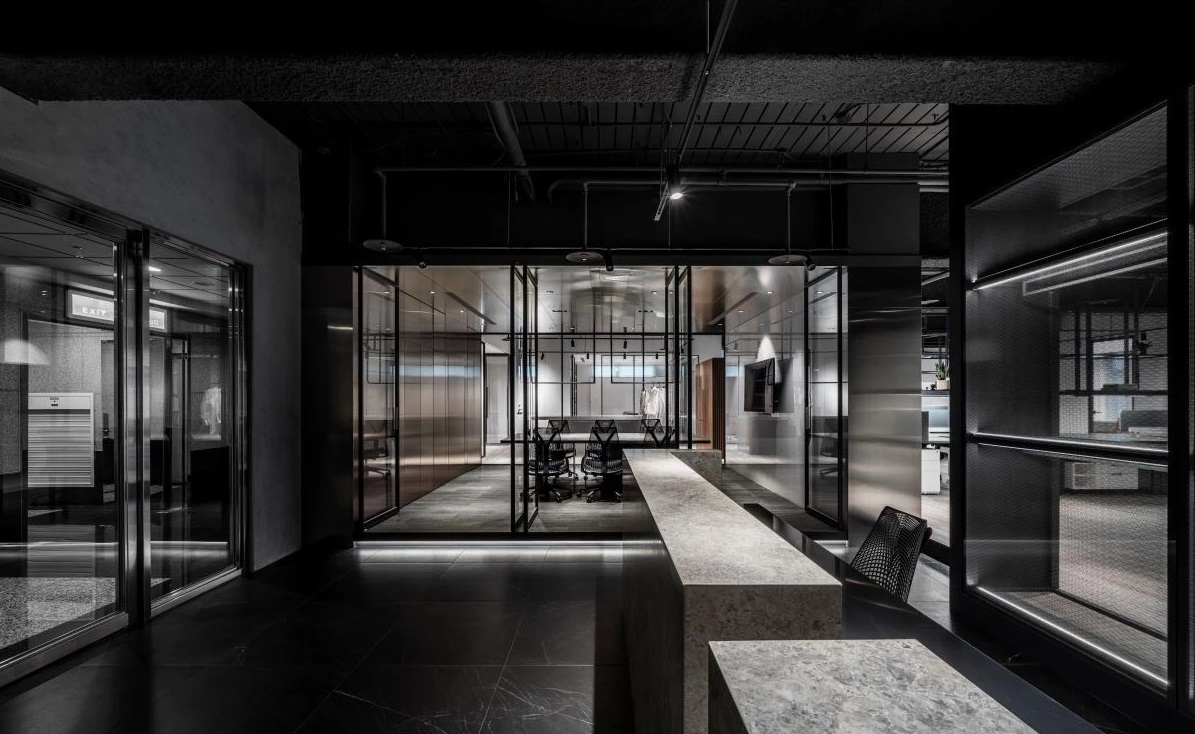 入口接待柜臺(tái)處運(yùn)用孔洞貼膜材質(zhì),塑造曖昧的透視流動(dòng),隱約透析后方陳列架的成衣產(chǎn)品和色彩,從入門(mén)起始的第一印象中,刻劃出公司品牌和業(yè)務(wù)意象。而穿透式的空間布局和金屬材質(zhì)的線性穿梭,將視野的高度與景深無(wú)限延伸,并運(yùn)用深邃低調(diào)的色系為基底,襯托出服裝材料的亮麗彩度;此外,透過(guò)靈活的多向性動(dòng)線設(shè)計(jì),輔以玻璃門(mén)片作為彈性秩序界定,可以即時(shí)滿足獨(dú)立作業(yè)、會(huì)議交流的調(diào)節(jié)使用。