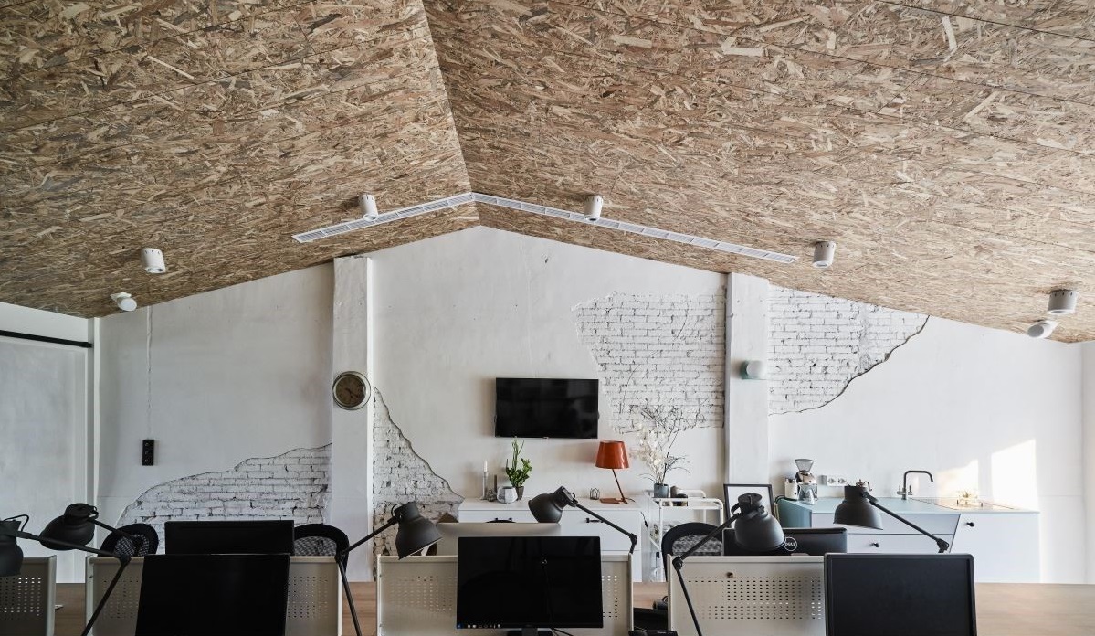 3F 辦公空間保留斜天花優(yōu)勢(shì),更運(yùn)用較深木色材質(zhì)肌理成就空間焦點(diǎn)。