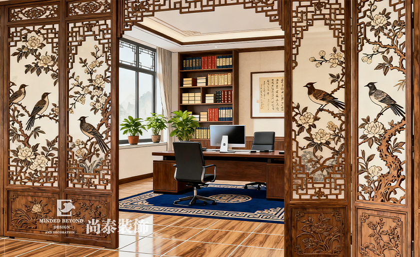 國(guó)風(fēng)辦公室裝修需兼顧 “文化底蘊(yùn)與功能實(shí)用”,尚泰裝飾擅長(zhǎng)將傳統(tǒng)元素現(xiàn)代化。其經(jīng)典方案為:墻面局部采用中式屏風(fēng)(可定制公司文化圖案),其余區(qū)域刷朱砂紅或墨黑乳膠漆,地面鋪仿木紋瓷磚,搭配中式地毯。