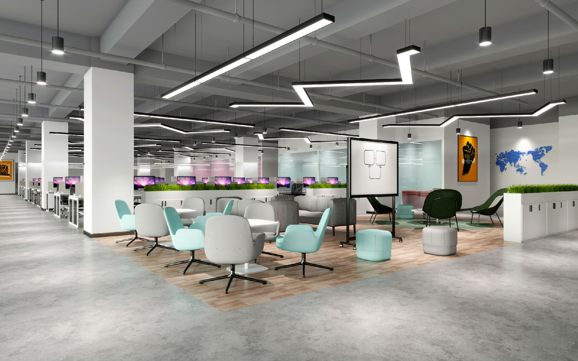 合理劃分辦公區(qū)、會(huì)議區(qū)、休閑區(qū)及接待區(qū),注重動(dòng)線流暢與隱私平衡。例如,采用玻璃隔斷增加透光性,或設(shè)置靈活移動(dòng)家具,適應(yīng)團(tuán)隊(duì)協(xié)作與獨(dú)立辦公的雙重需求。