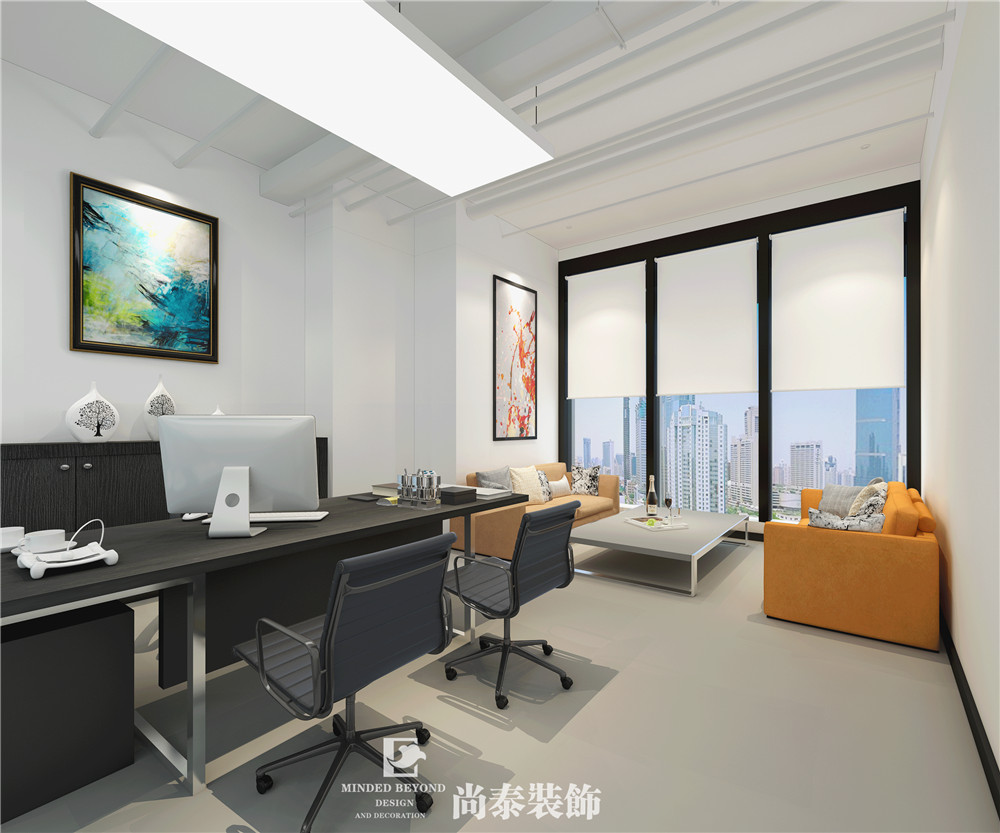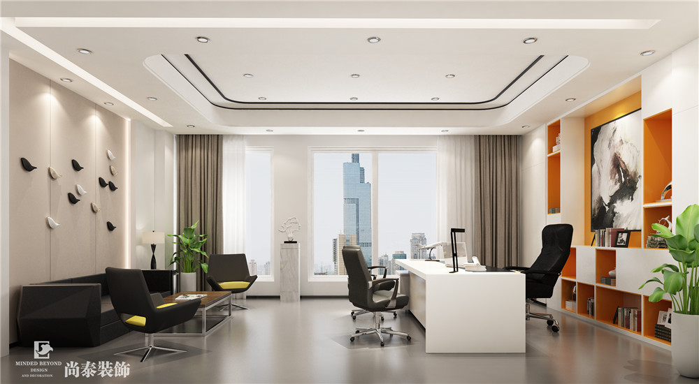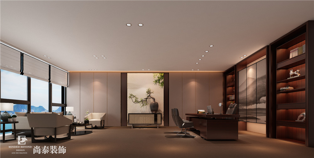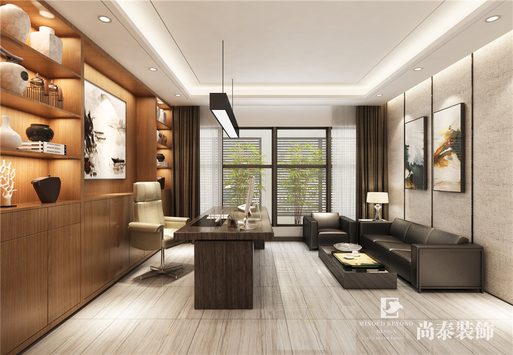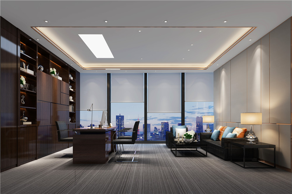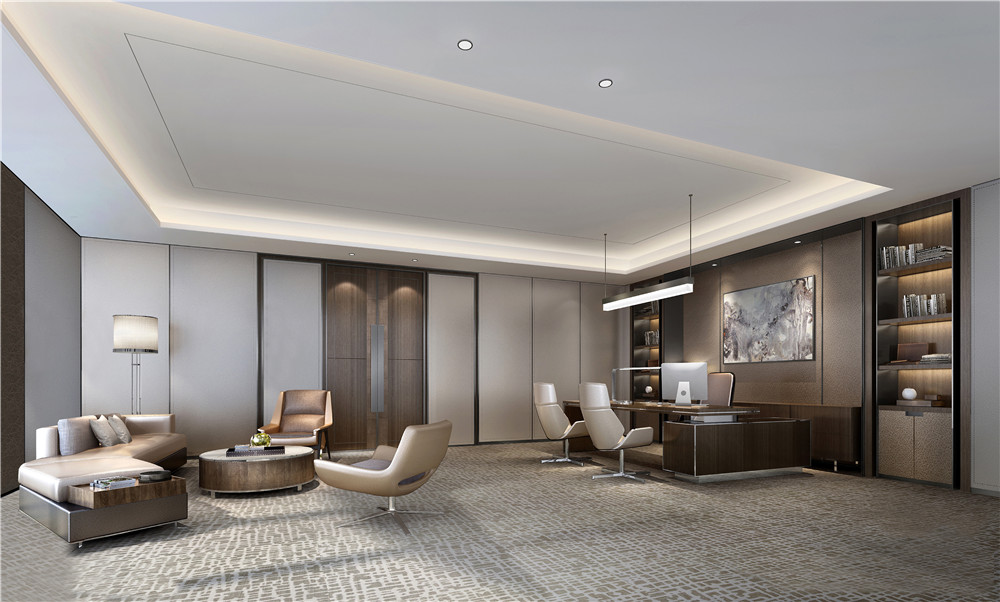總經(jīng)理辦公室裝修效果圖:辦公地點(diǎn)位于靠近窗戶的區(qū)域,這樣設(shè)計(jì)的目的就是希望將室外的景色引入室內(nèi),讓總經(jīng)理時(shí)時(shí)刻刻可以欣賞到自然的風(fēng)景,以自然之風(fēng)景為空間帶來(lái)生機(jī)。