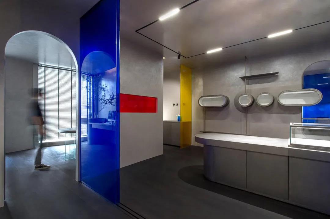 久宜珠寶辦公高明度三原色玻璃,給冷灰色調(diào)的展示空間帶來了什么?這是一個(gè)辦公+展示的珠寶公司空間設(shè)計(jì),設(shè)計(jì)師大膽地運(yùn)用高明度三原色玻璃,來對(duì)空間進(jìn)行裝點(diǎn)??臻g以冷灰色為主色調(diào),根據(jù)空間內(nèi)的動(dòng)線設(shè)計(jì),在不同的地方設(shè)計(jì)紅、黃、藍(lán)三種色彩的玻璃,運(yùn)用女性對(duì)色彩的敏感度來吸引她們走遍整個(gè)空間。