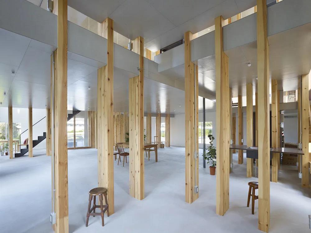 Mamiya Shinichi辦公室位于名古屋郊區(qū)的一處辦公室,設(shè)計用木柱代替了混凝土承重柱,30根木材柱子有序分列在空間里,讓人恍如在“小樹林”里面辦公,有木材清淡的自然清香……之前看過一些在空間中插入木桿子的設(shè)計,不知道是不是從這里得到的靈感。