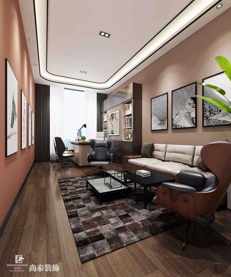 本案作為現(xiàn)代時尚風格的辦公室與展廳一體化空間,尚泰裝飾的辦公室裝修設(shè)計定位即是簡潔時尚與展廳奢華藝術(shù)漆料的展示,通過部分風格獨特的軟裝搭配結(jié)合天花燈光效果,營造出現(xiàn)代感極強的辦公氛圍和浪漫的異國情調(diào)樣板間空間。