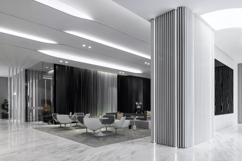 前廳入口處采用透光金屬板作為背景墻,平靜且富有層次的光感將訪客迎入充滿科技色彩的視覺空間。