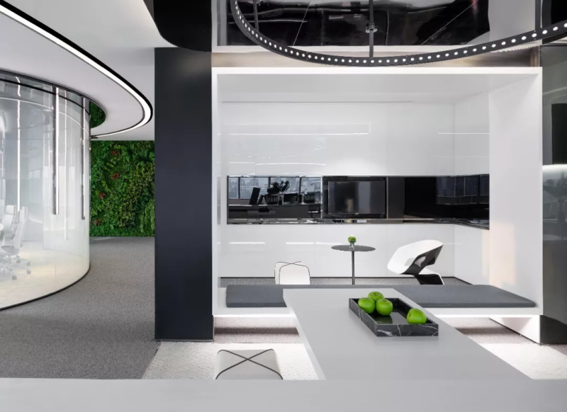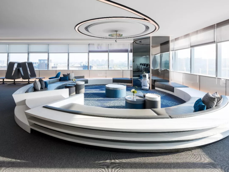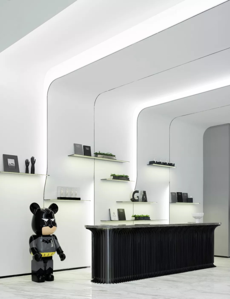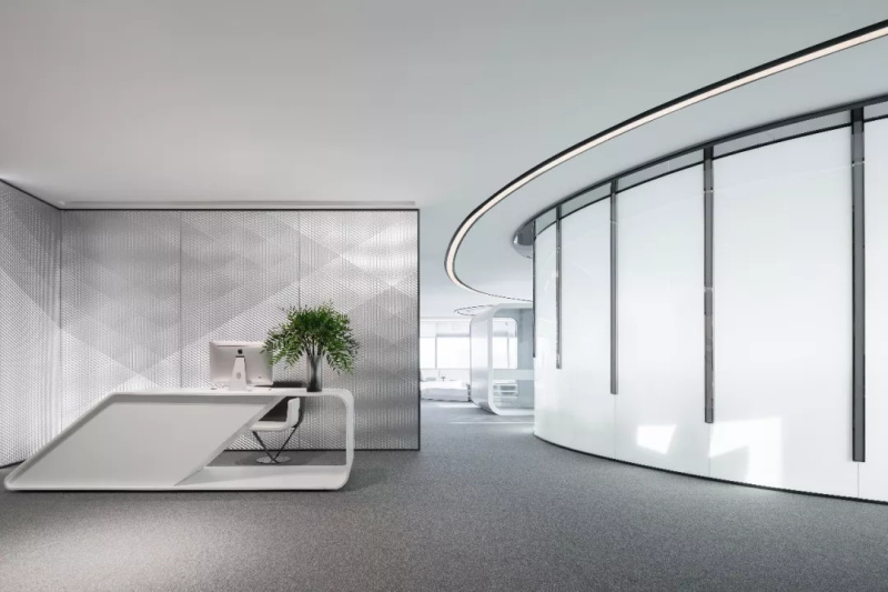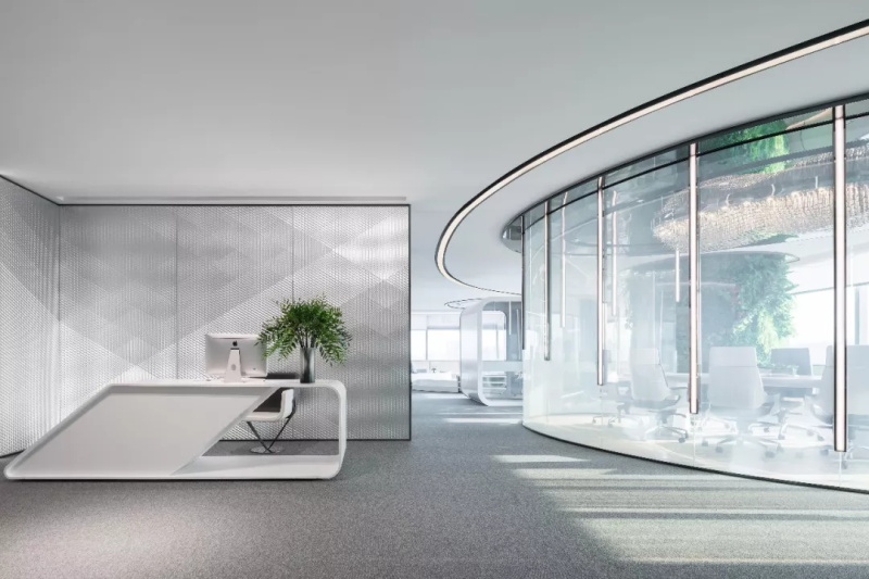 散發(fā)著自然、透氣的輕松氛圍。經(jīng)理室最吸睛的設(shè)計(jì)莫過于墻體天花板的曲線光帶,
