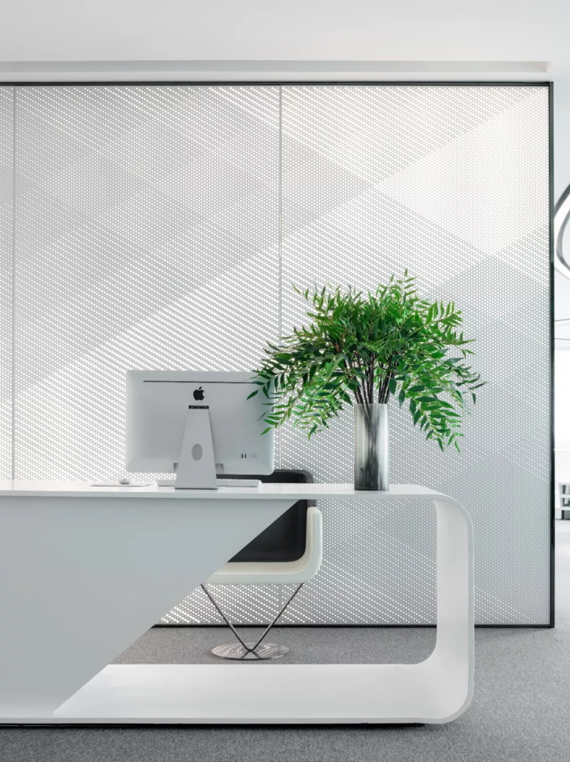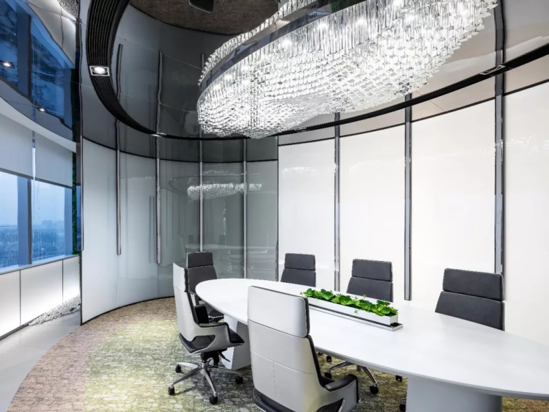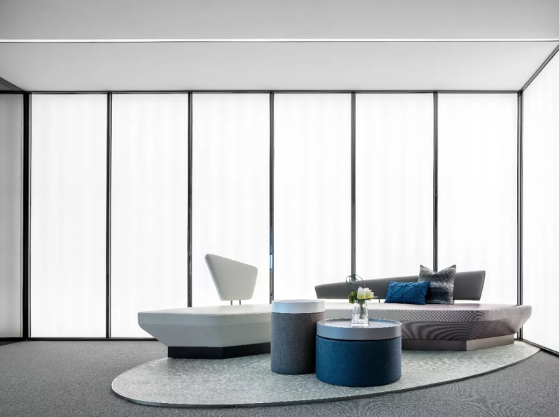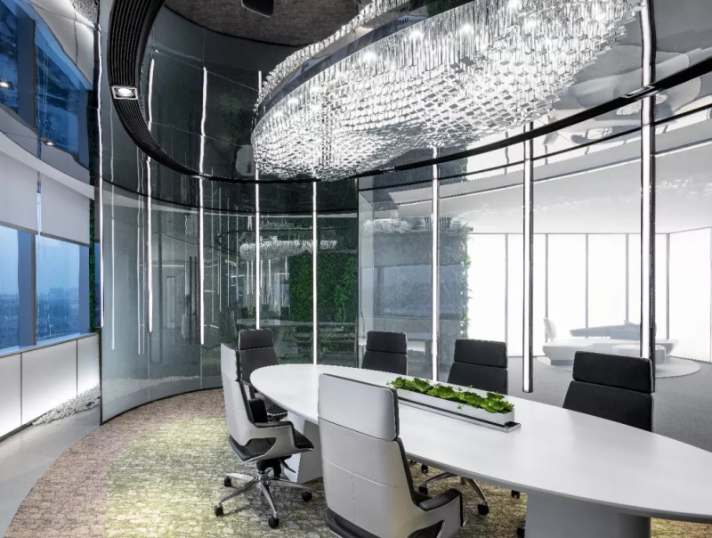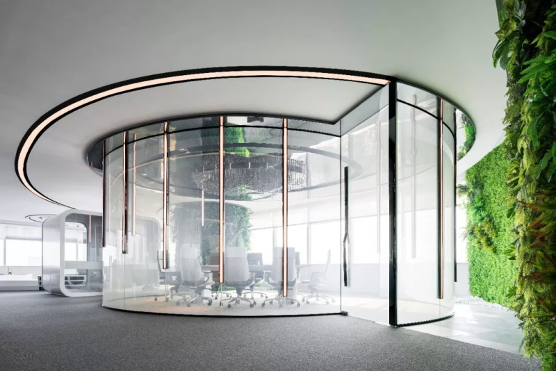 實(shí)現(xiàn)真正的花園式辦公。智能霧化玻璃通電變色,隔絕出相對(duì)隱蔽的私密空間,