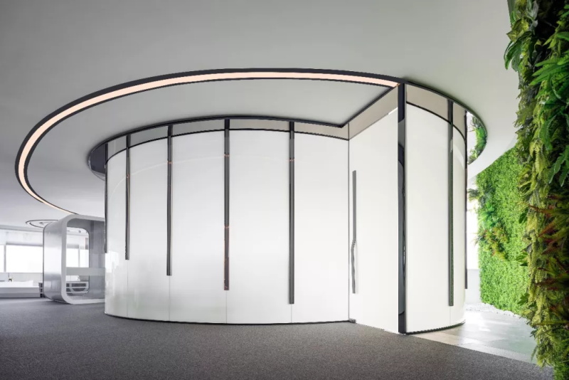擁有“艙體”概念的會(huì)議室,選用通電霧化玻璃作為半包式的“墻壁”,另一側(cè)則以植墻體環(huán)繞,
