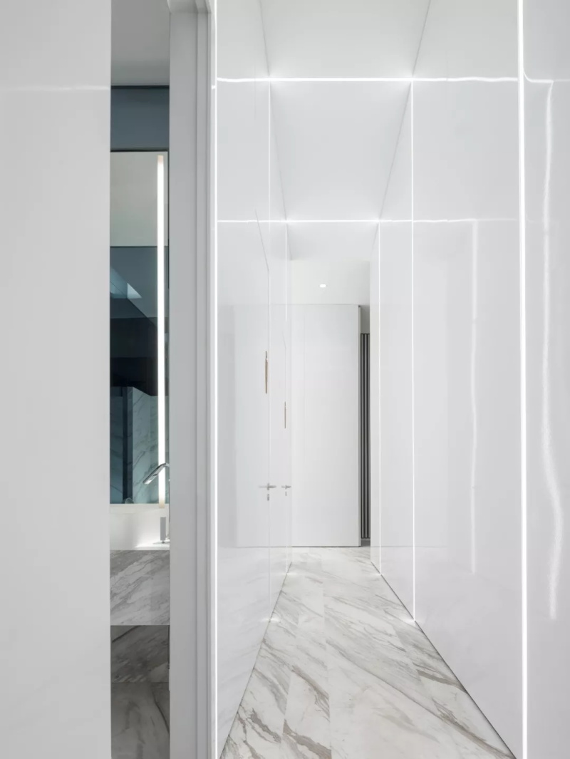 走道采用白色反光材質(zhì),蔓布其上的縱橫光帶交錯(cuò)成一個(gè)虛幻的多維時(shí)空,