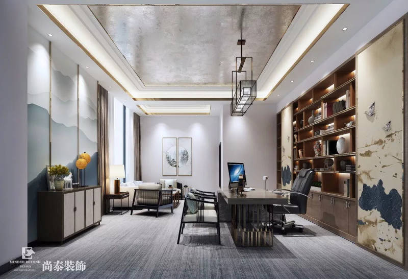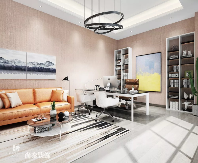 本案作為現(xiàn)代時(shí)尚風(fēng)格的辦公室與展廳一體化空間,尚泰裝飾的設(shè)計(jì)定位即是簡(jiǎn)潔時(shí)尚與展廳奢華藝術(shù)漆料的展示,