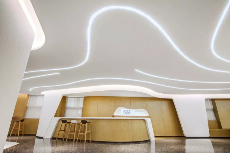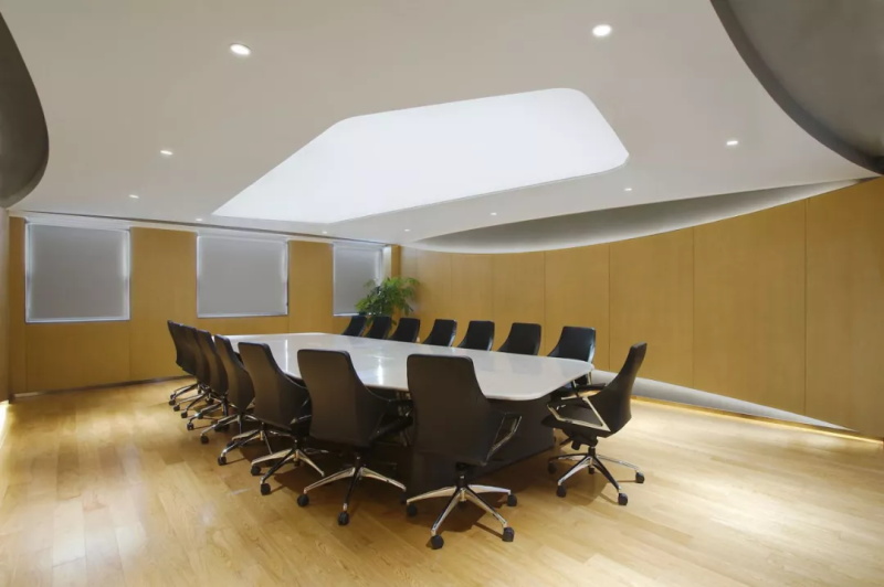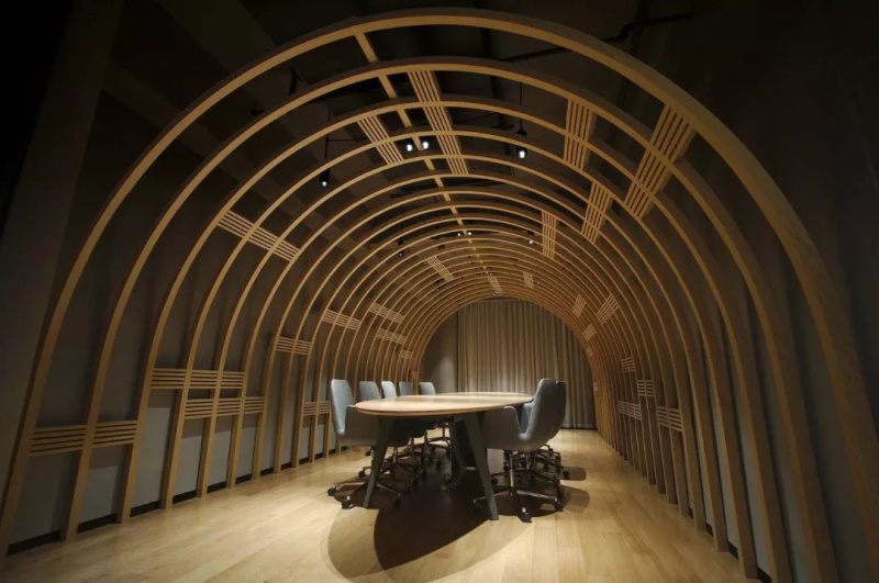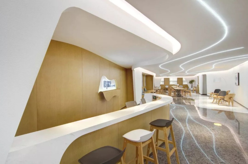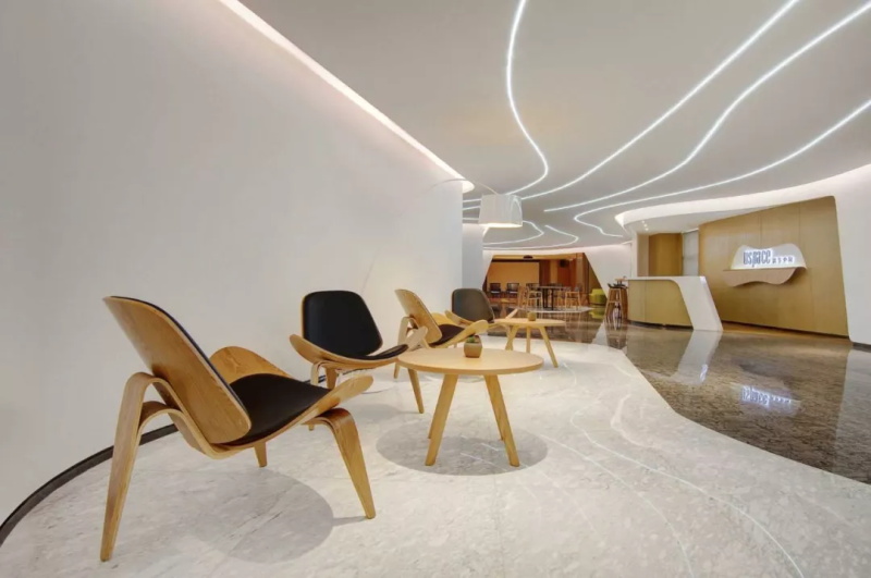 利用靈動感為空間的主要特性,使墻體展現一種自由連續(xù)的造型,流動的立面巧妙切換內外光的交互作用,光線也暈染了整片白色弧墻,投射出或深或淺的陰影,呈現出一種光影的變化,隨著時間這里彷佛有了通透游走的靈魂,也讓年輕的90甚至95后們感覺到在此感受的真正的自由。設計上利用溫潤的木、白色的墻、深淺的石材,以曲線在空間柔合并存,人在空間靈活的移動,隨性停留在散布的座椅,在動靜之間,創(chuàng)造出其獨有的韻律節(jié)奏,不同工作時態(tài)都能進退皆宜。各個不同大小的會議區(qū),也提供不同想象的生活場景。