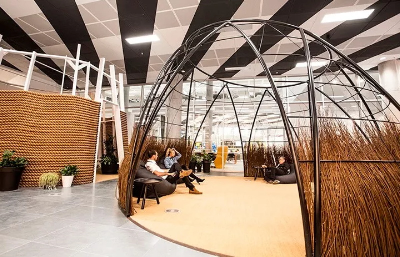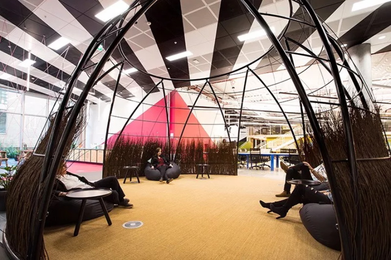 在以上案例中,可以看到這些元素:聯(lián)合辦公,倫敦、開(kāi)放共享、圖形設(shè)計(jì)、彩、黑白條紋、鋼管架構(gòu)的蒙古包、枯枝、下沉休息區(qū)、階梯座椅會(huì)議空間等形成等組合。