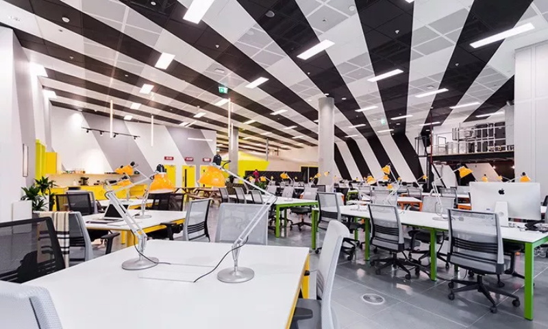 超高的室內(nèi)空間有著絕佳的舒適感受,設(shè)計(jì)團(tuán)隊(duì)以跳躍的色彩和幾何圖形塑造出一個(gè)精彩動(dòng)感的工作空間。頂面夸張的黑白條紋設(shè)計(jì),將原本平淡的空間呈現(xiàn)出強(qiáng)烈的時(shí)尚氣息和動(dòng)感韻律。明亮的黃色削弱了過(guò)于剛強(qiáng)的力感,帶來(lái)靈動(dòng)與青春的活力。
