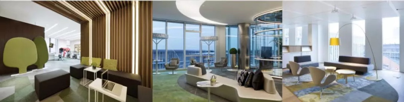 其中我們多采用幾何圖形和字幕組排的刷漆效果給原有單調(diào)乏味的墻面帶來新的活力。多開發(fā)新的員工休閑區(qū),也屬于網(wǎng)紅打卡區(qū),為員工的創(chuàng)作提供不同的靈感和想法,也提供了不同的休息空間放飛自我。主要色調(diào)為綠色和木色。網(wǎng)紅打卡區(qū)大膽采用豐富的顏色,為整個辦公空間帶來不同的風(fēng)景線。