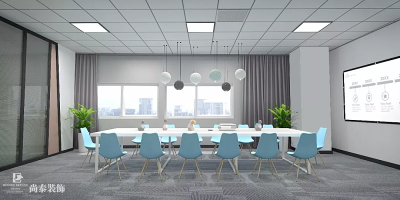 大會議室作為一個集中以及接待的區(qū)域,以藍(lán)色為主調(diào)色,在布置方面更為大氣,強調(diào)空間的儀式感。