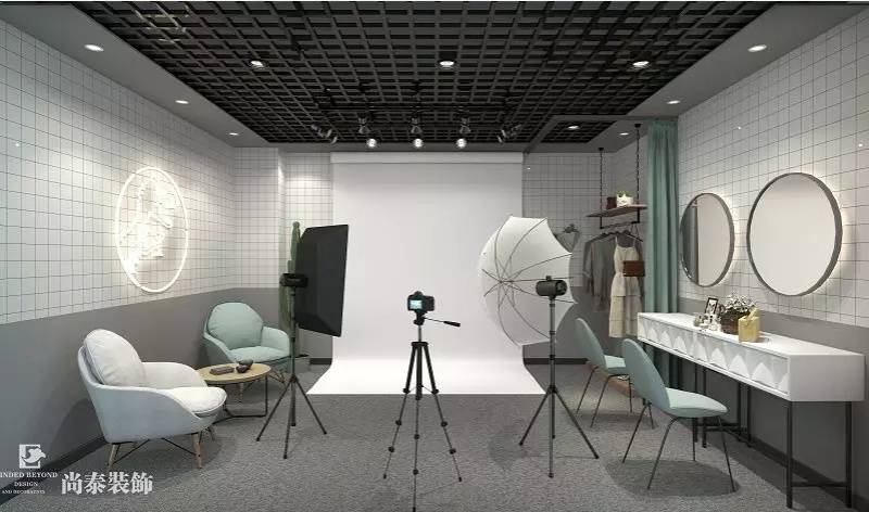 整個布景現(xiàn)代,簡潔以及溫馨,墻面采用幾何圖形,搭配化妝桌椅和鏡面,還配有茶幾和采訪桌椅,將現(xiàn)代時尚完美的詮釋出來。