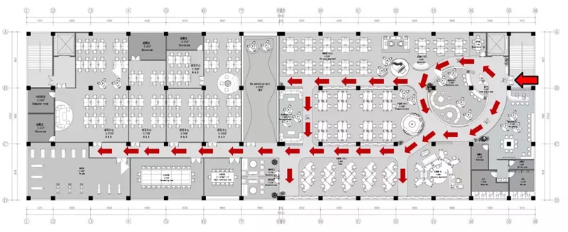 本案設計在滿足辦公空間功能需求的前提下,設計師運用現(xiàn)代簡約、工業(yè)風的設計語言,體現(xiàn)了建筑空間原有的美感,整體線條流暢,充分研究辦公空間動線,分析人員辦公為模式,精準劃分功能分區(qū),提高空間綜合使用率。