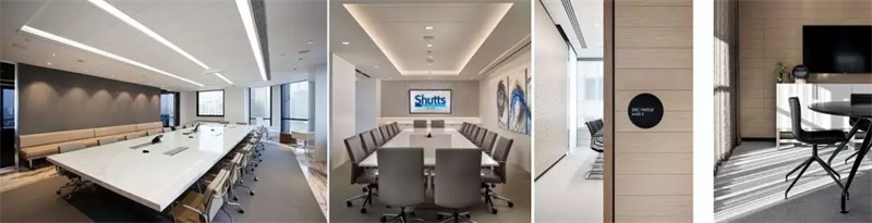 會議室作為一個集中以及接待的區(qū)域,以灰白色為主調(diào)色,在布置方面更為大氣,強調(diào)空間的儀式感。材質(zhì)方面主要采用新型環(huán)保的材質(zhì),以及體現(xiàn)質(zhì)感的冷色系材質(zhì)進行空間裝飾和搭配。