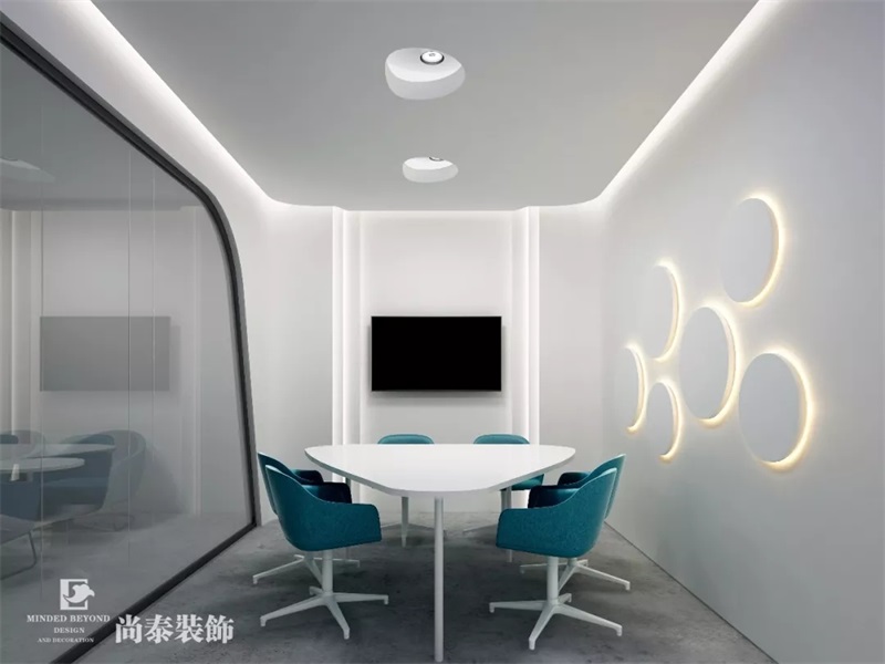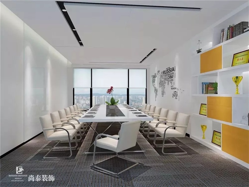 ▲會議室是公司經(jīng)常頭腦風(fēng)暴的地方,不僅要透風(fēng),還要視野好,不能太沉悶,否則在開會時很容易瞌睡,所以一般尚泰設(shè)計(jì)師在給客戶設(shè)計(jì)時會盡量活潑輕快,大量的淺色鋪白,深灰色的地毯,舒適的座椅,更會調(diào)動員工的積極性。